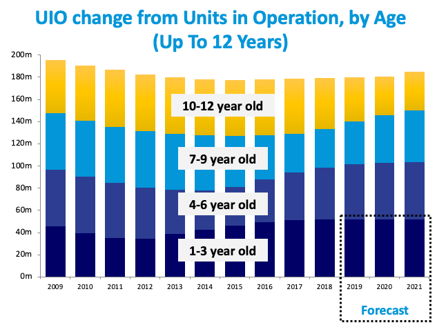 Aging UIO. Most industry analysts predict a flat to declining new vehicle market through 2021. This means fewer one- to three- year old vehicles to service, with a corresponding increase in four- to six- year old vehicles.